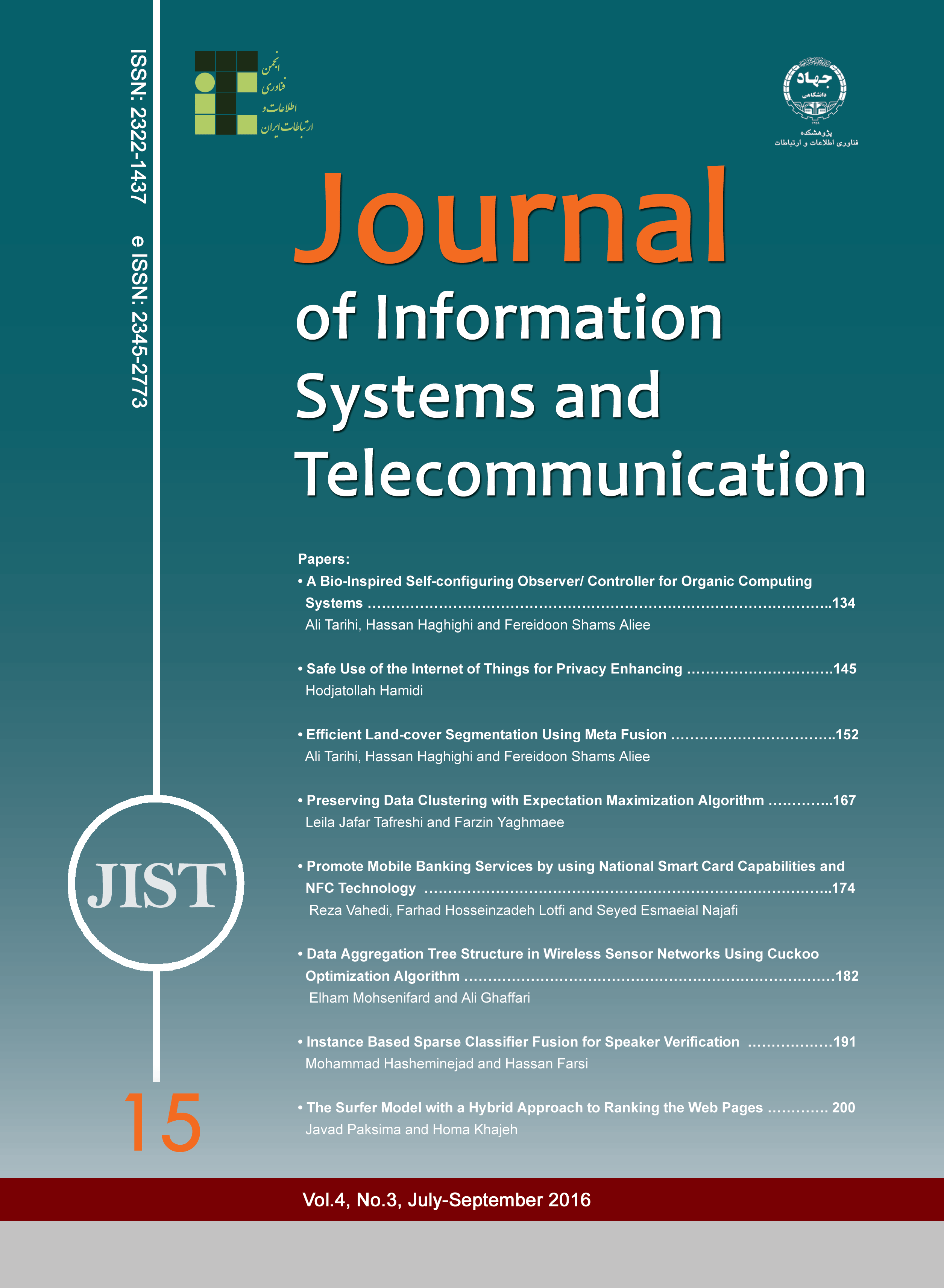 List of Articles Open Access Article Abstract Page Full-Text 1 - A Bio-Inspired Self-configuring Observer/ Controller for Organic Computing Systems Ali Tarihi Hassan Haghighi Fereidoon Shams Aliee 10.7508/jist.2016.03.001 Open Access Article Abstract Page Full-Text 2 - Safe Use of the Internet of Things for Privacy Enhancing Hojatallah Hamidi 10.7508/jist.2016.03.002 Open Access Article Abstract Page Full-Text 3 - Efficient Land-cover Segmentation Using Meta Fusion Morteza Khademi Hadi Sadoghi Yazdi 10.7508/jist.2016.03.003 Open Access Article Abstract Page Full-Text 4 - Preserving Data Clustering with Expectation Maximization Algorithm Leila Jafar Tafreshi Farzin Yaghmaee 10.7508/jist.2016.03.004 Open Access Article Abstract Page Full-Text 5 - Promote Mobile Banking Services by using National Smart Card Capabilities and NFC Technology Reza Vahedi Sayed Esmaeail Najafi Farhad Hosseinzadeh Lotfi 10.7508/jist.2016.03.005 Open Access Article Abstract Page Full-Text 6 - Data Aggregation Tree Structure in Wireless Sensor Networks Using Cuckoo Optimization Algorithm Elham Mohsenifard Behnam Talebi 10.7508/jist.2016.03.006 Open Access Article Abstract Page Full-Text 7 - Instance Based Sparse Classifier Fusion for Speaker Verification Mohammad Hasheminejad Hassan Farsi 10.7508/jist.2016.03.007 Open Access Article Abstract Page Full-Text 8 - The Surfer Model with a Hybrid Approach to Ranking the Web Pages Javad Paksima Homa Khajeh 10.7508/jist.2016.03.008